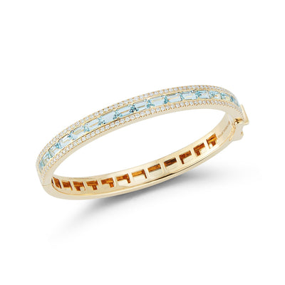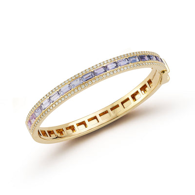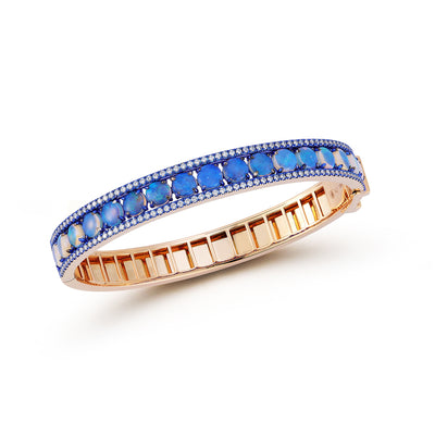 An 18K rose gold bangle bracelet with Imperial Topaz and White Diamonds set in a pattern around the circumference.