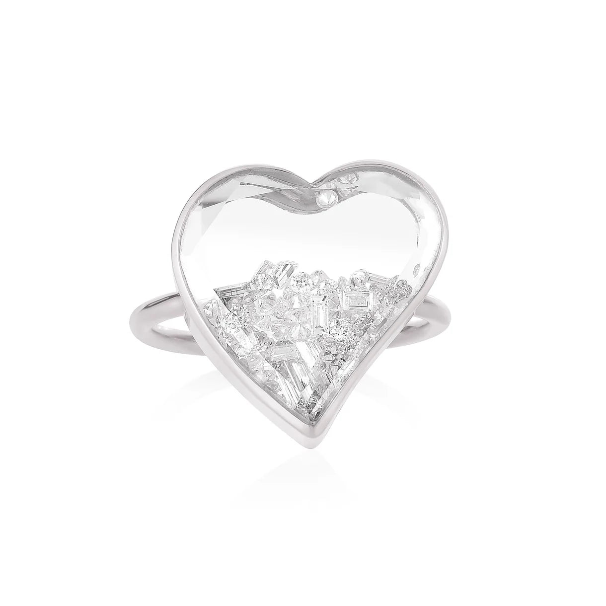 The Afago Diamond Ring in 18 karat rose gold timelessly encapsulates a heart shaped white sapphire Kaleidoscope Shaker™ filled with diamonds and baguettes. This ring is water resistant.