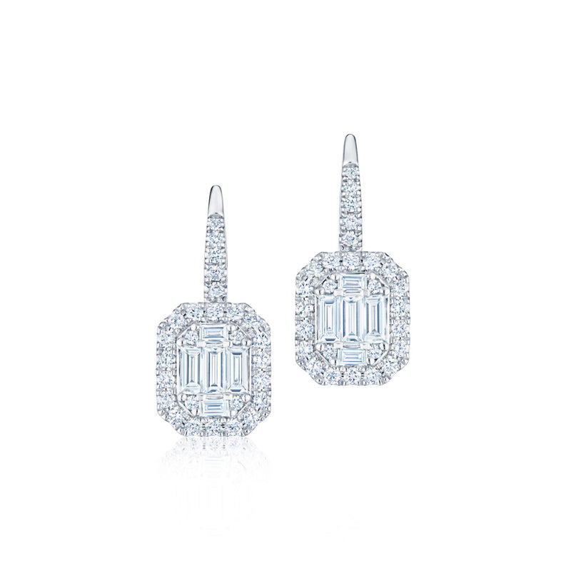 Sunburst Emerald Cut Diamond Drop Earrings with Halo
